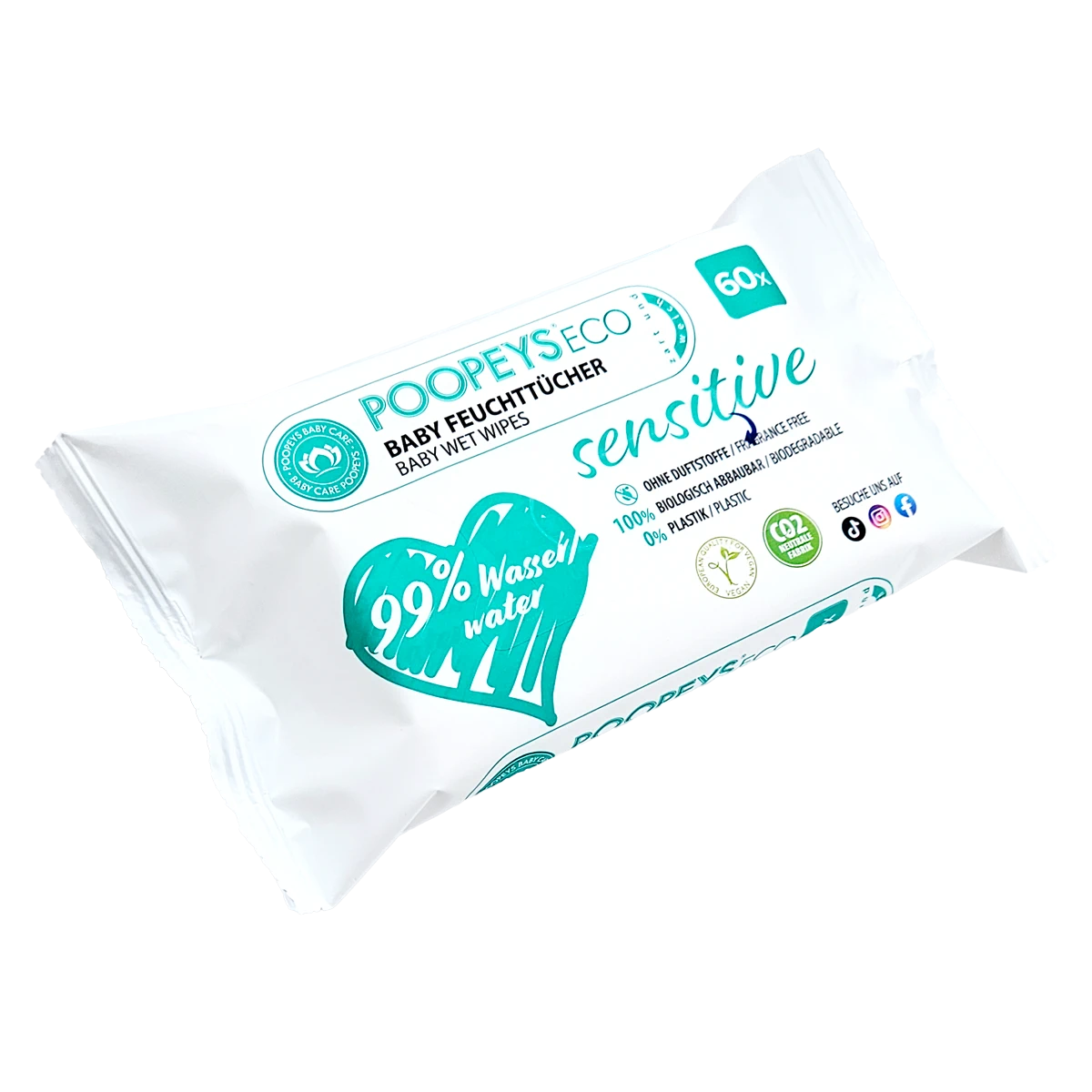 POOPEYS ECO SENSITIVE sind die natürlichsten Feuchttücher in unserem Sortiment, entwickelt für die empfindliche und zarte Haut von Babys. Hergestellt aus 100 % biologisch abbaubaren Materialien und komplett plastikfrei, sind sie die perfekte Wahl für umweltbewusste Eltern. Mit einer Formel, die zu 99 % aus Wasser und natürlichen Inhaltsstoffen besteht, reinigen diese Tücher die Haut sanft und bewahren deren natürliche Balance. Sie sind duftfrei und hypoallergen, ideal auch für die empfindlichste Babyhaut.