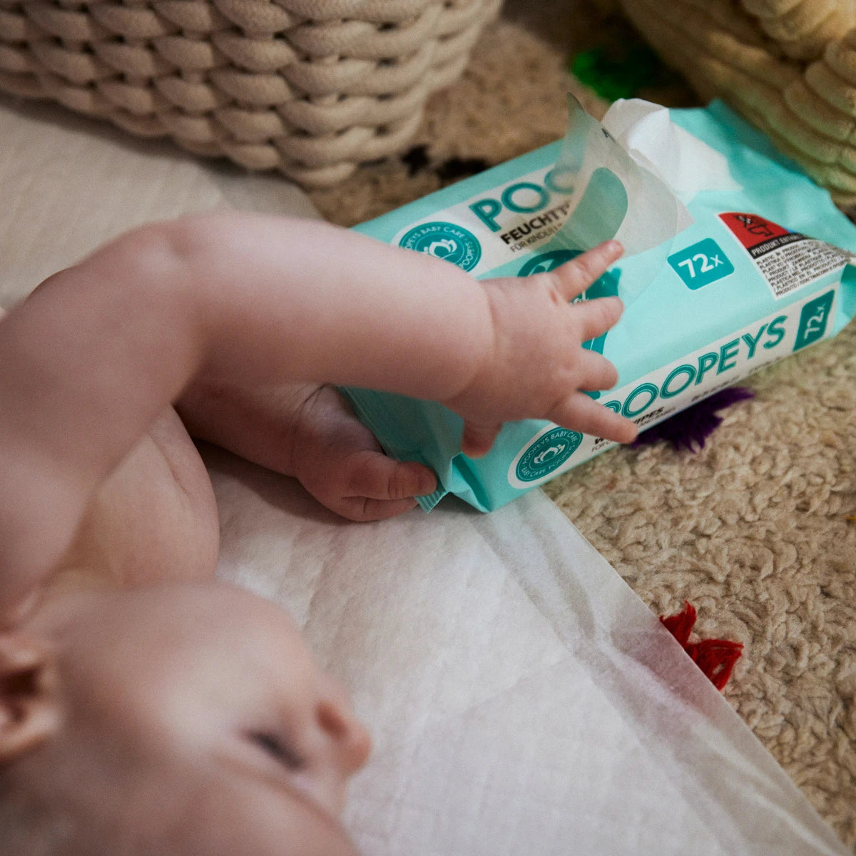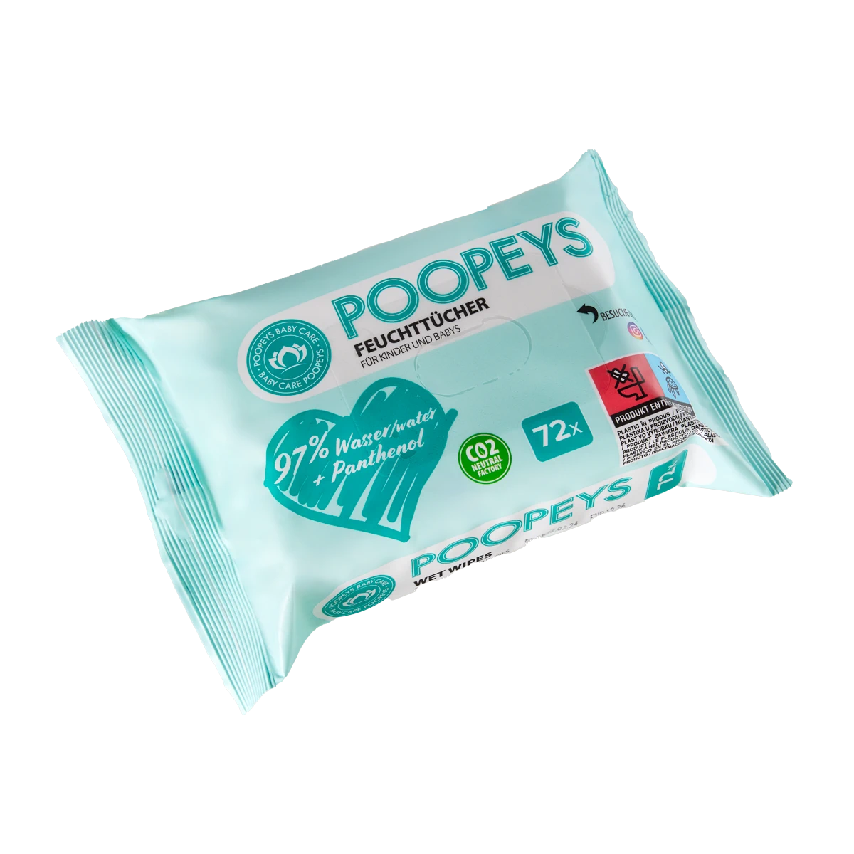 Unsere POOPEYS Feuchttücher sind mit einer milden und schonenden, speziell für die Babyhaut entwickelten Formel, angereichert. Die Tücher enthalten 97 % Wasser und keine schädlichen Chemikalien. Hochwertig, sicher und sauber für die Haut Deines Babys!