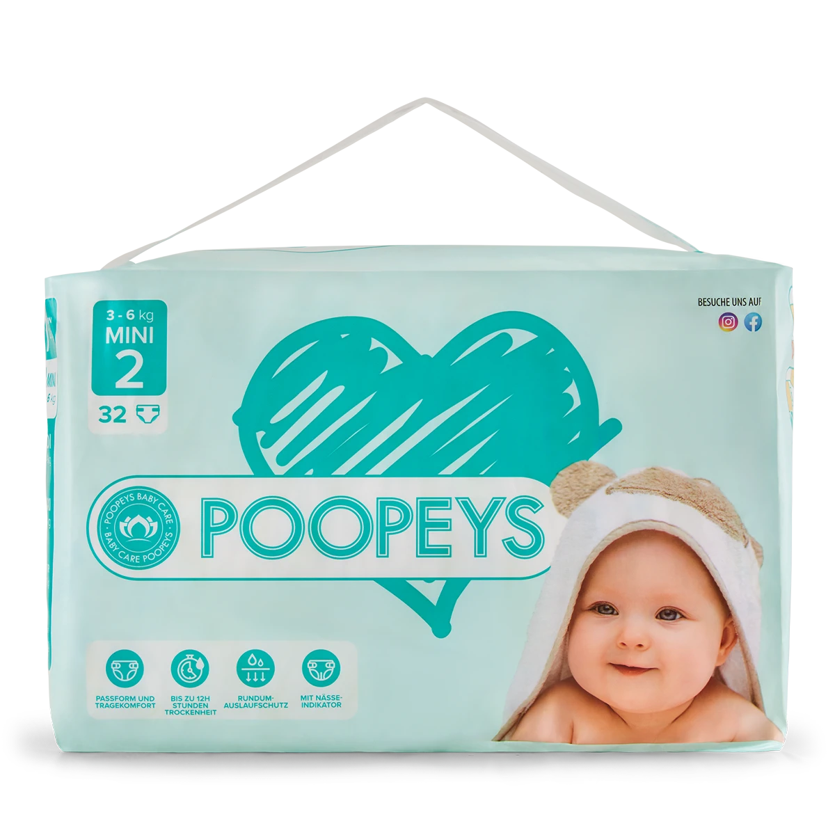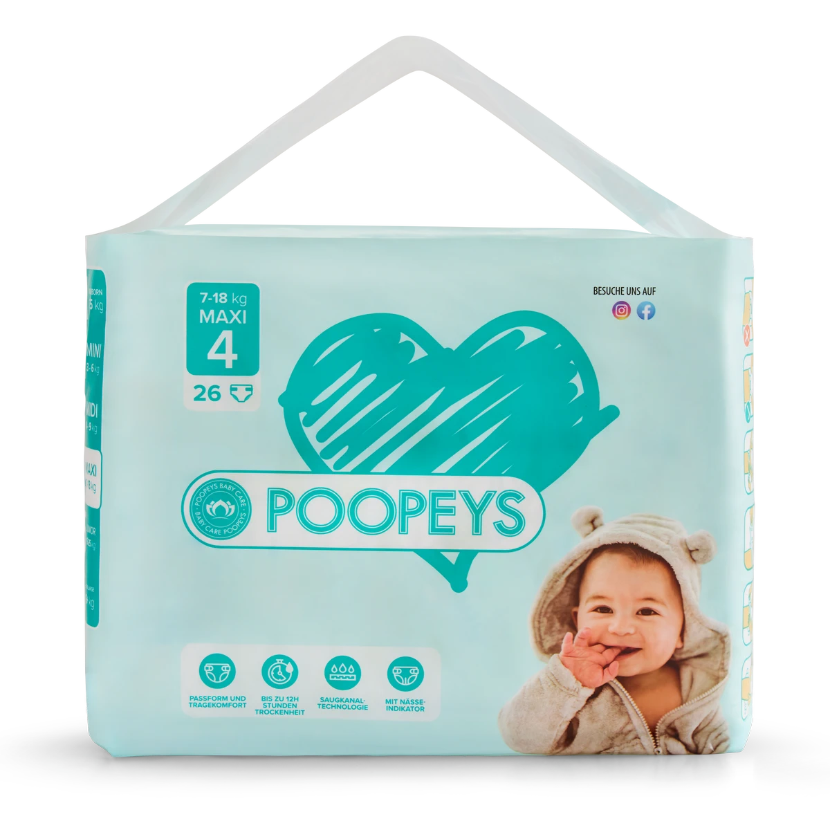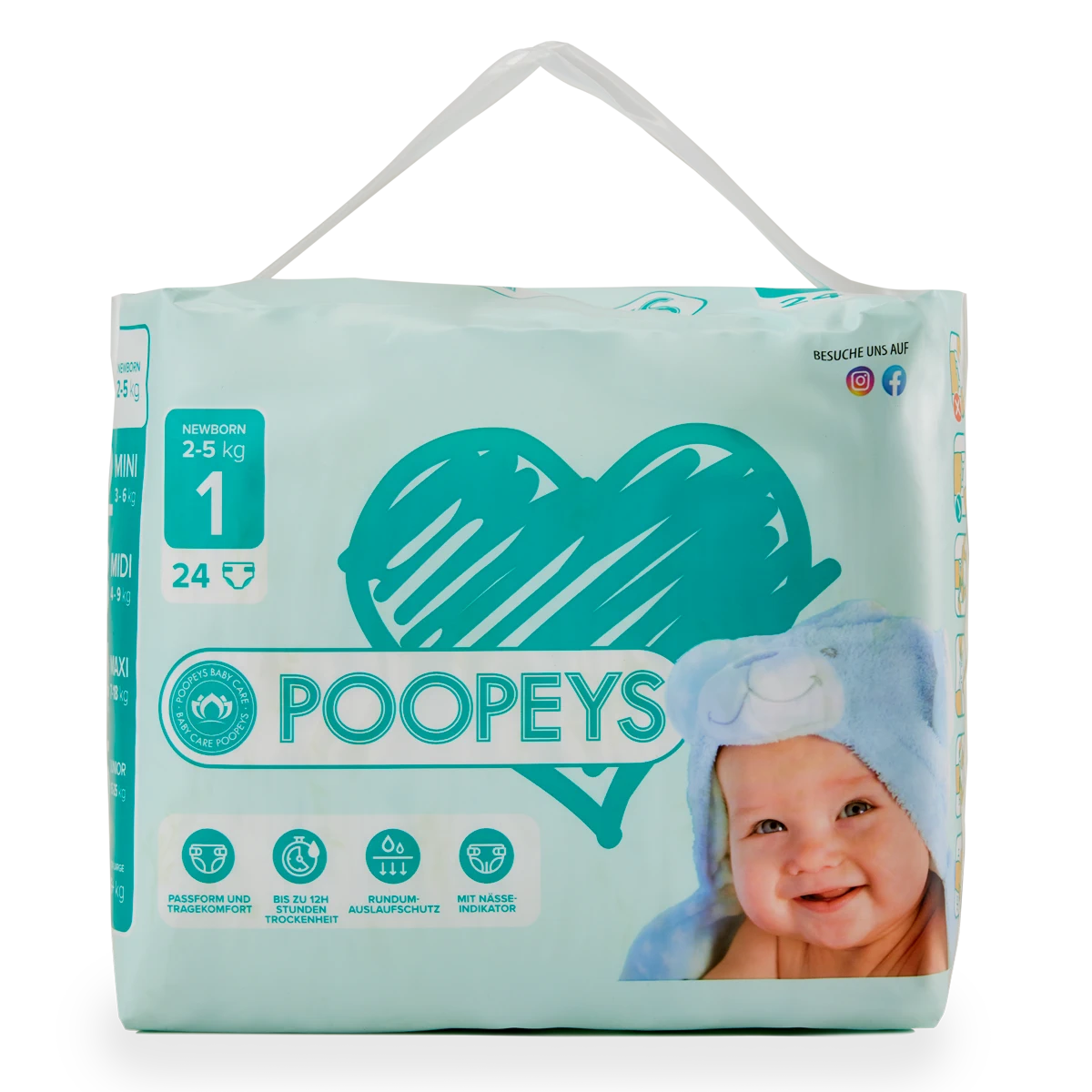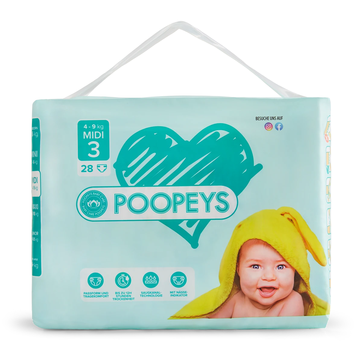 Unsere POOPEYS Windeln und Pants - fortschrittlicher Auslaufschutz mit Nässeindikator, weich und elastisch für einen super Tragekomfort und unser klassisches Design!